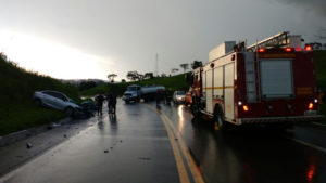 Chovia no momento do acidente e o caminhão ficou sob a pista de rolamento enquanto o carro de passeio rodou na pista e bateu num barranco ficando encostado a margem deste.