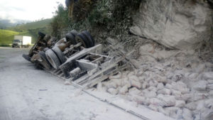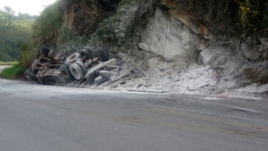 O corpo do condutor Daniel José da Silva, 37 anos que conduzia um caminhão com placas de Mar de Espanha-MG e que por motivos desconhecidos veio a perder o controle direcional do veículo em que estava e que conduzia cal hidratada, indo de encontro a um paredão de rochas situado na lateral da pista.