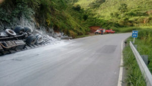 Apoio da Polícia Rodoviária Estadual que dentre outras atividades interditou parcialmente o tráfego de veículos para a retirada do caminhão e aguarda para a retirada da carga que derramou na pista.