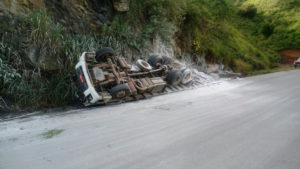 O corpo do condutor Daniel José da Silva, 37 anos que conduzia um caminhão com placas de Mar de Espanha-MG e que por motivos desconhecidos veio a perder o controle direcional do veículo em que estava e que conduzia cal hidratada, indo de encontro a um paredão de rochas situado na lateral da pista.