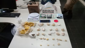 Dentro de sua residência, foram localizados, ao todo: 10 tabletes de cocaína de tamanhos variados; 17 porções de mesma substância, em diversos tamanhos; 11 invólucros plásticos pequenos também de cocaína; 01 invólucro de maconha; 01 pote branco com diversas embalagens de sacolés; 03 balanças; 01 celular; 01 caixa de madeira tipo cofrinho com nomes gravados; 01 documento pessoal.