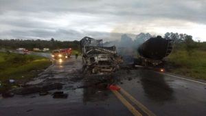 Quando os bombeiros chegaram ao local verificaram que se tratava da colisão entre os veículos Carreta tanque de placas HBG 6099, licenciado em Campo Belo/MG e que segundo seu condutor de 58 anos tráfegava sob forte chuva em direção a SJDR, no intuito de abastecê-lo com leite.