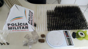 Posteriormente, a equipe PM seguiu para a rsidência da vítima, onde encontraram: 02 porções de maconha, 02 balanças; 568 pinos de cocaína vazios.