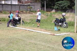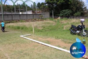 Quando chegamos aqui deparamos com essa situação, serraram as traves de um dos gols, removendo-as e jogando-as em um terreno ao lado do campo.