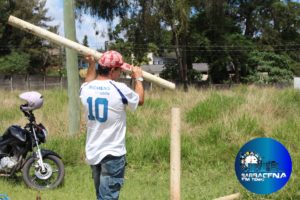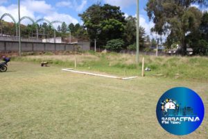 Quando chegamos aqui deparamos com essa situação, serraram as traves de um dos gols, removendo-as e jogando-as em um terreno ao lado do campo.