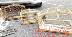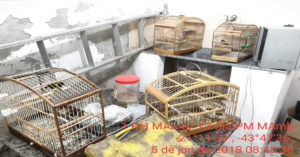 Avistado também 02 pássaros híbridos interespecíficos sendo 02 pintagol e um alçapão para apanha de pássaros.