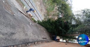 Entretanto o cachorro na ânsia de alcançar o gato veio a ficar preso no local não tendo condições de sair onde havia este paredão a uma altura aproximada de 10 metros.
