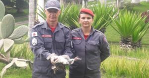 No local os Bombeiros verificaram que a ave se encontrava com as asas feridas tendo a mesma está enrolada em linha de cerca.