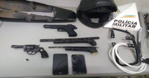 Na residência do homem que fugiu, foram encontrados o celular e o capacete roubados das vítimas e uma motocicleta roubada em data anterior. Nas residências dos adolescentes foram encontrados o revólver calibre .32 e 03 réplicas de armas, usados no roubo.