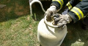 Manhã de sábado, por volta das 10h30, Bombeiros receberam ligação de uma pessoa relatando que um botijão se encontrava em chamas, incendiando móveis de uma área de lazer de um sitio na zona rural de Barbacena.