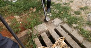 Após avaliação a equipe de Bombeiros protegeu a criança com cobertor e efetuou a quebra da base do dormente sem danificar o bueiro movimentando o suficiente para retirada da perna do garoto.