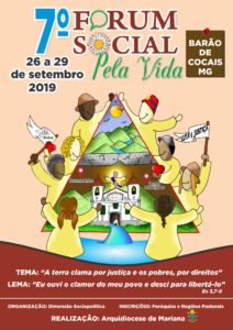 Estão abertas as inscrições para a sétima edição do Fórum Social Pela Vida, que será realizado de 26 a 29 de setembro, no Ginásio Poliesportivo, em Barão de Cocais, sob o tema “A terra clama por justiça e os pobres, por direitos” e lema “Eu ouvi o clamor do meu povo e desci para libertá-lo” (Ex 3,7-8). A partir desta quinta-feira (1), os interessados podem procurar as paróquias ou centro regionais para se inscrever. A taxa de inscrição para ajudar nos gastos do Fórum é de RS30,00.