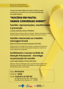A Escola de Saúde Pública do Estado de Minas Gerais (ESP-MG) realizará, no próximo dia 09 de outubro às 13hs, o seminário: “Suicídio em Pauta: Vamos Conversar Sobre?”. A atividade, promovida pelo Curso de Especialização em Saúde Pública, marca os debates do setembro amarelo e a importância da discussão do tema para a Saúde Pública e a sociedade. Evento será realizado no auditório da Escola e é aberto ao público (sujeito a lotação).
