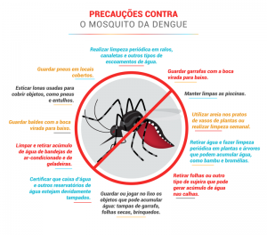 A dengue tem quatro tipos, conhecidas como sorotipos 1, 2, 3 e 4. Entre os sintomas da doença, estão febre alta súbita, dores de cabeça, no corpo e nas articulações, náuseas e vômitos. É importante lembrar que a dengue pode até matar. Então, caso os sintomas da doença se manifestem, procure a unidade de saúde mais próxima para o diagnóstico e tratamento adequado. E previna-se, eliminando possíveis focos do mosquito, em locais de acúmulo de água parada, como garrafas, pneus, calhas, ralos e vasos de plantas.