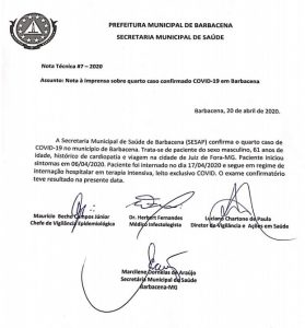 A Prefeitura de Barbacena, através da Secretaria Municipal de Saúde (Sesap), confirmou, nesta segunda-feira (20), o quarto caso de Covid-19 no Município. O paciente do sexo masculino, 61 anos de idade, com histórico de cardiopatia e esteve em viagem na cidade de Juiz de Fora.