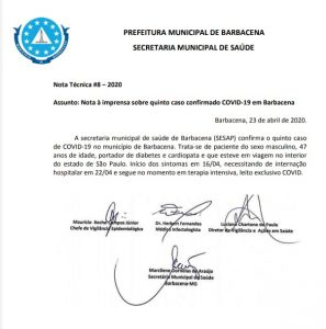 O quinto caso de Covid-19 no município de Barbacena foi confirmado pela Prefeitura, através da Secretaria Municipal de Saúde (Sesap), na noite desta quinta-feira (23). Trata-se de paciente do sexo masculino, 47 anos de idade, portador de diabetes e cardiopata e que esteve em viagem no interior do estado de São Paulo.