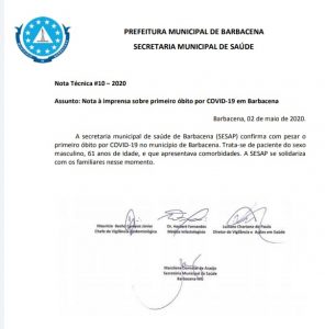 A Prefeitura de Barbacena, através da Secretaria Municipal de Saúde (Sesap), registra, com pesar, na tarde deste sábado (02), o primeiro óbito por Covid-19 no Município. Trata-se de paciente do sexo masculino, de 61 anos de idade e que apresentava comorbidades.