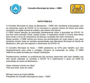 A Prefeitura de Barbacena, através do Conselho Municipal do Idoso de Barbacena (CMID), preocupada com o grande número de idosos circulando na região central da cidade e nos bairros, emitiu uma nota pública manifestando preocupação com as pessoas nas ruas, devido aos crescentes casos de Covid-19 no Município.