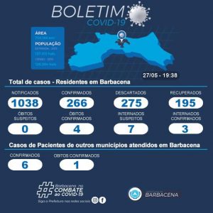 A cidade também atingiu o número de 266 casos confirmados da COVID-19, seis a mais que o Boletim do dia 26/05. O número de casos recuperados também aumentou de 193 para 195.