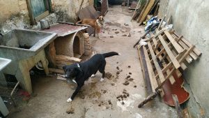 Dando andamento no atendimento foi localizado em outro cômodo fechado com taboas, sem iluminação natural um cão da raça pitbull, no local possuía grande quantidade de fezes.