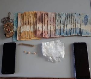 Diante das informações foi realizada a operação policial que prendeu dois suspeitos de tráfico de drogas e apreendeu 12 aparelhos celulares, 25 porções embaladas e três pedras de substância semelhante ao crack; três tabletes, um cigarro, três buchas e uma porção embalada de substância semelhante à maconha, várias embalagens plásticas, um cartão de memória, três cheques totalizando o valor de R$338,50, a quantia de R$10.497,00 em dinheiro e outros objetos.