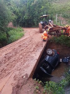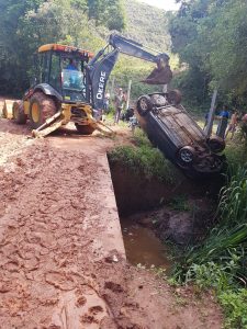 Quando passava por sobre uma ponte sem proteção lateral , veio a perder o controle do veículo caindo nas águas do Córrego Bandeirinhas, vindo o veículo a ficar com as rodas para cima.