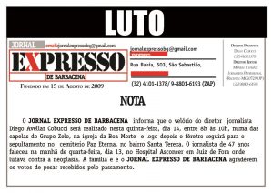 Morreu na manhã desta quarta-feira (13), em Juiz de Fora, onde estava internado para tratamento de um câncer, o jornalista barbacenense Diego Cobucci (foto), um dos fundadores e proprietários do Jornal Expresso, de Barbacena. Ele exercia a função de diretor do semanário impresso e atuava também como repórter de rua.