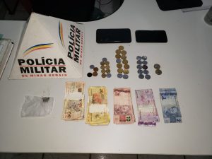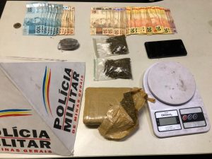 Encontraram o seguinte material: 01 barra, 02 embalagens plásticas e 01 tablete de maconha; 01 celular, 01 balança e uma quantia em dinheiro de R$ 2.076,00. Autor conduzido e encaminhado à Delegacia de Polícia.