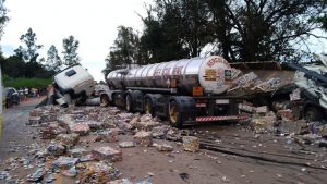 um caminhão da empresa Herculano, que transportava ácido sulfúrico colidiu com uma carreta que transportava alumínio para reciclagem.