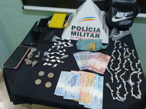 foram apreendidos 87 (oitenta e sete) pedras de crack, 27 (vinte e sete) papelotes de cocaína, 04 (quatro) buchas de maconha, a quantia de R$ 391,00 (trezentos e noventa e um reais) em dinheiro, 04 (quatro) aparelhos celulares e materiais para armazenamento de drogas. Os três abordados foram presos e conduzidos juntamente com todo o material apreendido.