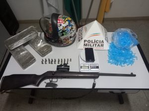 No imóvel foram encontradas duas sacolas contendo 03 (três) barras de maconha, diversos pinos utilizados para “dolar” cocaína, uma balança de precisão, 18 (dezoito) munições calibre .38 (06 percutidas), 01 uma munição .32 percutida, um aparelho celular, 01 (um),capacete, 01 (um) rifle calibre .22 e uma motocicleta Yamaha Factor YBR 125 ED de cor preta e placa OLY-5979.