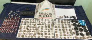 Assim, procedidas as buscas, houve o encontro de 113 (cento e treze) pedras de crack e 09 (nove) papelotes de maconha, bem como meia barra prensada dessa substância e outros três tabletes. Também foram localizados mais materiais utilizados para embalar drogas e dois aparelhos celulares.