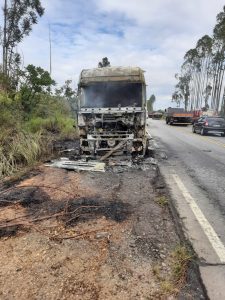 No local, um caminhão com placa do Rio Grande do Sul se incendiou após apresentar problemas mecânicos. Ao perceber a situação, o motorista conseguiu desengatar a carga de minério e, por isso, apenas o cavalo mecânico se incendiou.
