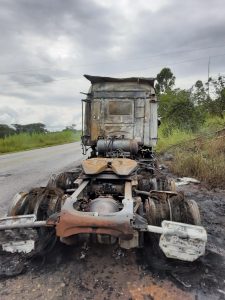 No local, um caminhão com placa do Rio Grande do Sul se incendiou após apresentar problemas mecânicos. Ao perceber a situação, o motorista conseguiu desengatar a carga de minério e, por isso, apenas o cavalo mecânico se incendiou.