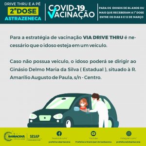Nos dois dias a vacinação acontece via Drive-Thru no pátio da Igreja de Santo Antônio, no bairro Santo Antônio e a pé no Ginásio Delmo Maria da Silva (colégio estadual) na Rua Amarílio Augusto de Paula, S/N – Centro.