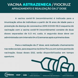 A Prefeitura Municipal de Barbacena (PMB) através da Secretaria Municipal de Saúde (Sesap) divulgou as datas para os idosos com mais de 84 anos receberem a segunda dose da vacina contra à Covid-19 da AstraZeneca/Oxford. Este grupo recebeu a primeira dose do imunizante entre os dias 08 a 12 março e por ter recebido a vacina do laboratório AstraZeneca, o tempo de intervalo entre as doses é maior.