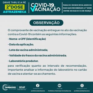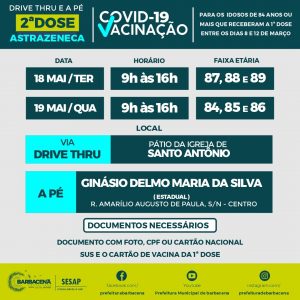 A Prefeitura Municipal de Barbacena (PMB) através da Secretaria Municipal de Saúde (Sesap) divulgou as datas para os idosos com mais de 84 anos receberem a segunda dose da vacina contra à Covid-19 da AstraZeneca/Oxford. Este grupo recebeu a primeira dose do imunizante entre os dias 08 a 12 março e por ter recebido a vacina do laboratório AstraZeneca, o tempo de intervalo entre as doses é maior.