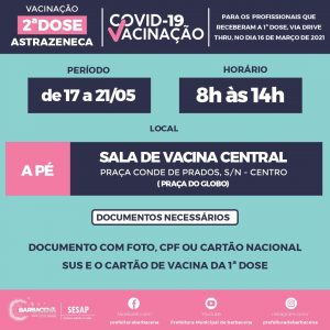 Os profissionais de saúde que receberam a 1ª dose da vacina da Astrazenca/Oxford no dia 16 de março, poderão receber a segunda dose do imunizante de 17 a 21 de maio, de 08h às 14h na sala de vacina central, situada na Praça Conde de Prados.