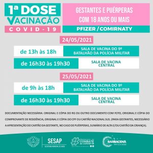 25/05: A vacinação continua para gestantes e puérperas pela manhã de 09h às 12 e a tarde 13h às 18h no 9º Batalhão. Também haverá imunização de 17h às 20h na Sala de Vacina da Central de Imunização.