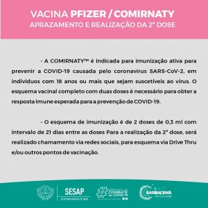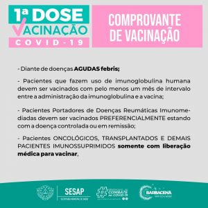 É importante que a população barbacenense não realize o cadastro caso não haja os documentos que comprovam a presença no grupo destinado a vacina na referida data. Também receberá a vacina da Pfizer, conforme disponibilidade e após imunizar todo o público de gestantes e puérperas, o grupo de diabéticos de qualquer tipo com idade entre 40 a 44 anos.