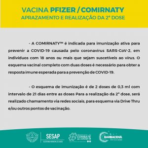 Na próxima quarta-feira (26/05) haverá vacinação da primeira dose para diabéticos de 40 anos ou mais. As vacinas que serão aplicadas serão Pfizer e AstraZeneca. Nessa estratégia a vacinação ocorrerá na sala de vacina do 9º Batalhão de Polícia Militar, de 09h às 18h e na Sala de Vacina da Central de Imunização de 16:30 às 19:30. Nessa estratégia, não será utilizada a modalidade de Drive-Thru e é necessário que seja feito um cadastro online através do endereço: http://barbacena.mg.gov.br/vacina/