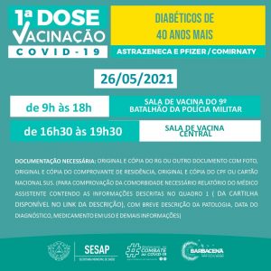 Na próxima quarta-feira (26/05) haverá vacinação da primeira dose para diabéticos de 40 anos ou mais. As vacinas que serão aplicadas serão Pfizer e AstraZeneca. Nessa estratégia a vacinação ocorrerá na sala de vacina do 9º Batalhão de Polícia Militar, de 09h às 18h e na Sala de Vacina da Central de Imunização de 16:30 às 19:30. Nessa estratégia, não será utilizada a modalidade de Drive-Thru e é necessário que seja feito um cadastro online através do endereço: http://barbacena.mg.gov.br/vacina/