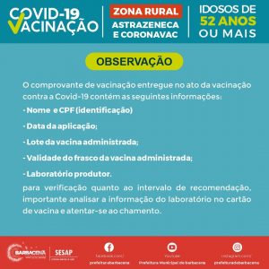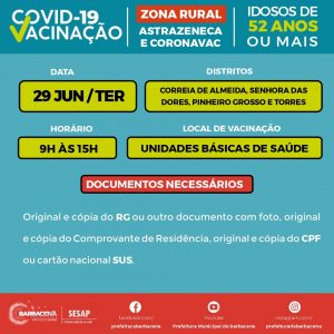 Acontece nesta terça-feira (29/06), a vacinação contra a Covid-19 de pessoas a partir de 52 anos nas Unidades Básicas de Saúde (UBSs) da Zona Rural de Correia de Almeida, Senhora das Dores, Pinheiro Grosso e Torres.