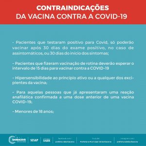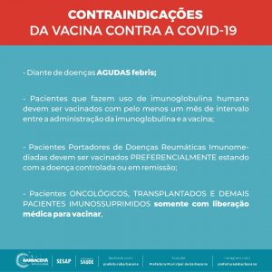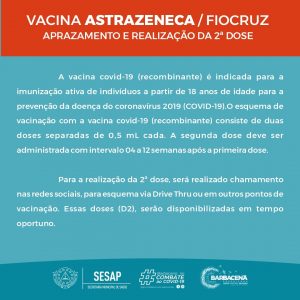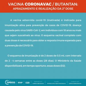 O processo de imunização será de 09h às 15h e o imunizante aplicado será da CoronaVac e Astrazeneca. Para vacinar é necessário apresentar a seguinte documentação: original e cópia do RG ou outro documento com foto, original e cópia do comprovante de residência, original e cópia do CPF ou Cartão Nacional SUS.