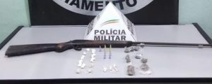 Além de 01 (uma) espingarda tipo polveira, houve a localização de 15 (quinze) papelotes de cocaína e outros 11 (onze) pinos contendo a mesma substância. Também foram encontradas 11 (onze) buchas de maconha e 11 (onze) pedras de crack. Nenhum suspeito foi localizado no local. As substâncias foram entregues na Delegacia de Polícia.