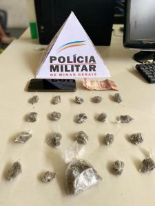 Ao ser dada busca no jovem infrator, que estava no interior do estabelecimento, encontraram, nas suas vestes, 01 porção de maconha, R$ 10,00 em nota e 01 celular.